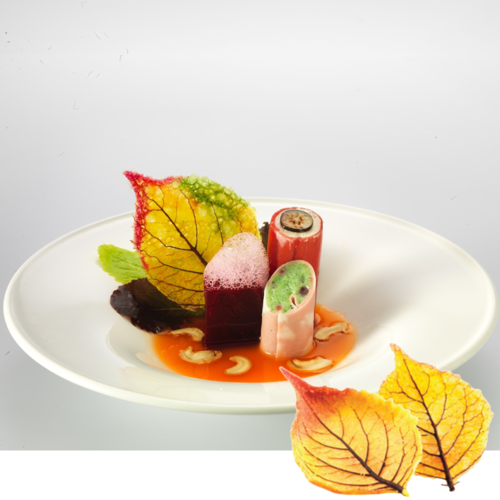 料理の盛り付けを引き立てるためにデザインされた、自然の葉に着想を得た食材です。保存料不使用で体にやさしく、甘味・塩味どちらの料理にも合い、イタリアの職人が一枚ずつ丁寧に手作りしています。